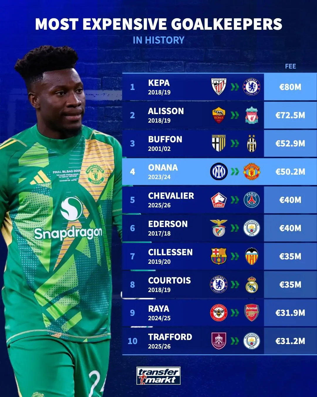 虎扑09月09日讯 德国转会市场盘点了足坛历史上转会费最高的门将球员,详情如下: